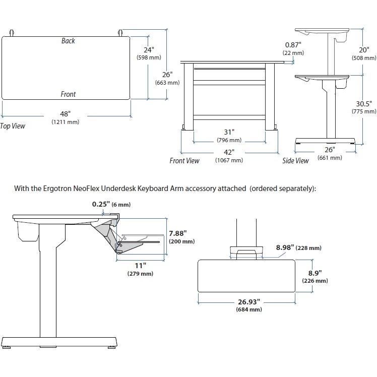 | Keyboard Arm | For proper ergonomic keyboard placement, Ergotron’s Neo-Flex Underdesk Keyboard Arm, 97-582-009, is recommended |