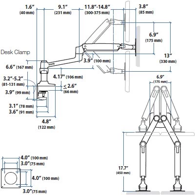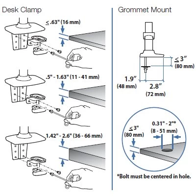 | Desk Clamp | Attaches to edge up to 2.6″ (66 mm) thick; grommet mount attaches through hole 5/16″ to 2″ (8–50 mm) wide and up to 3″ (76 mm) thick |