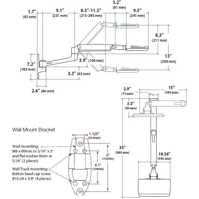 - Arm extends keyboard tray up to 35″ (89 cm); 13″ (33 cm) height adjustment