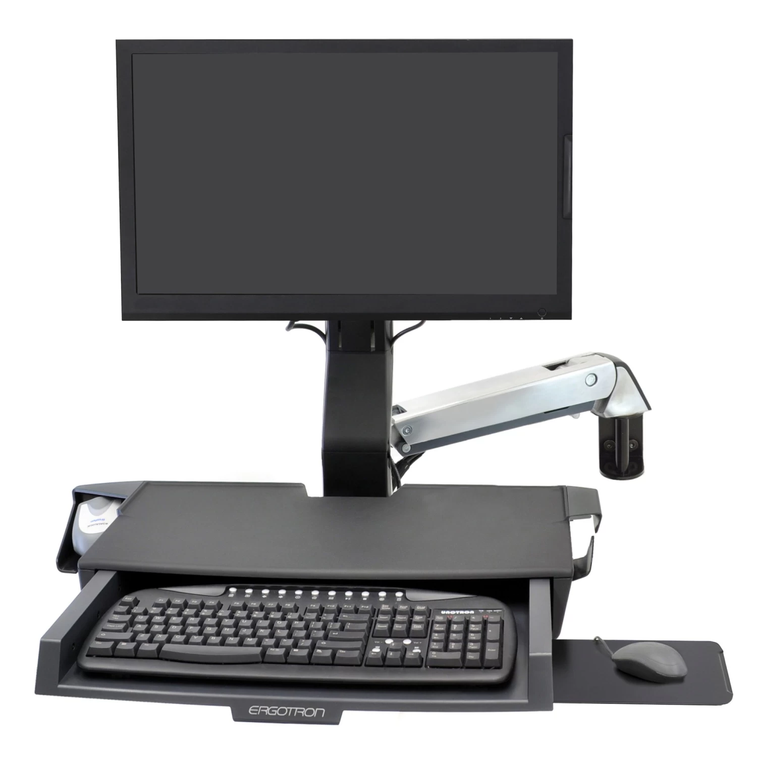 Ergotron 45-260-026 holds a monitor, bar-code scanner, keyboard, wrist