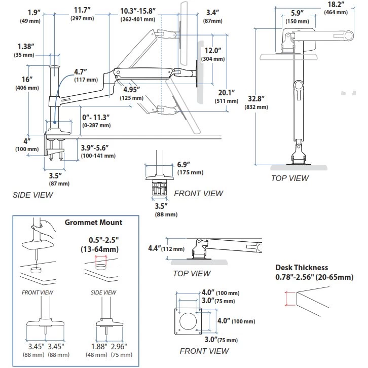 | Mounting Options | Desk clamp attaches to edge up to 2.5″ (65 mm) thick; grommet mount attaches through hole 0.5″ to 2.5″ (7–65 mm) wide and up to 2.5″ (65 mm) thick |