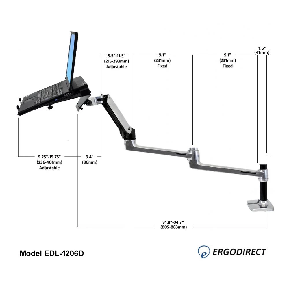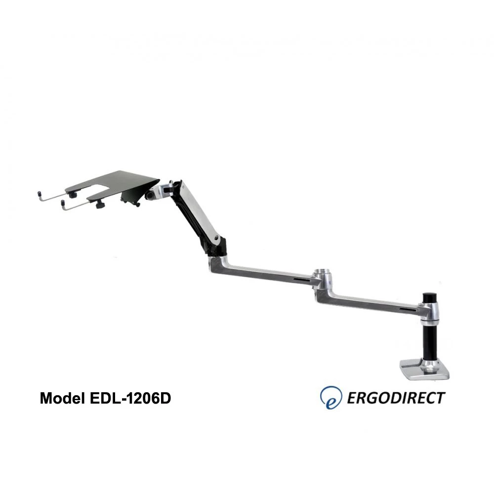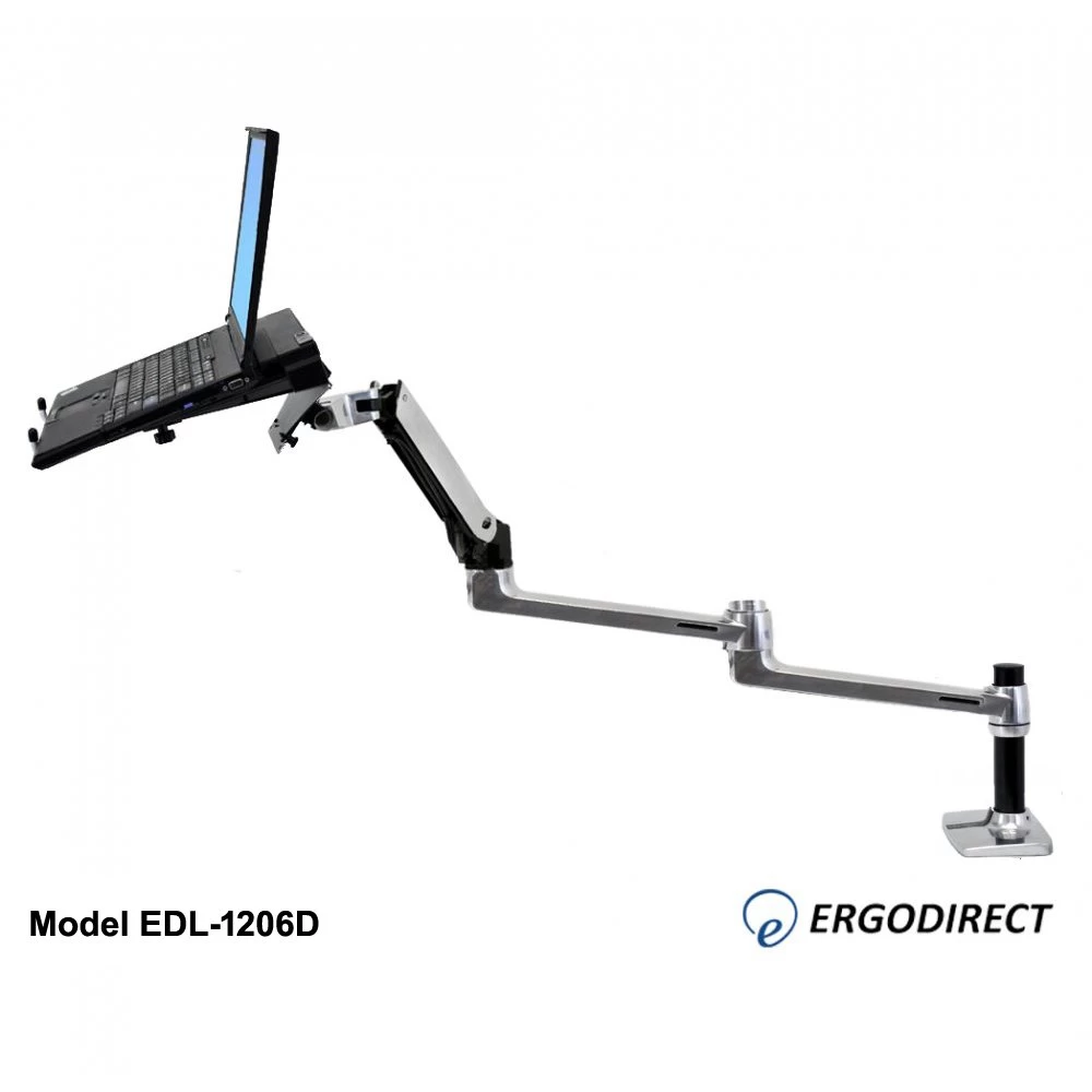 Laptops were designed for convenience and portability, but these features also mean laptops are not ergonomic. Often, laptop users suffer from back pain and eye stress because they must work on their laptop in a hunched-over position. The EDL-1206D is a long reach height adjustable laptop arm that makes laptop use more ergonomic. This extended laptop arm mounts on the desk, and offers 34″ of horizontal reach and 13″ of up and down movement. These flexible adjustments allow you to adjust your laptop to an ideal ergonomic height and distance from the desk.