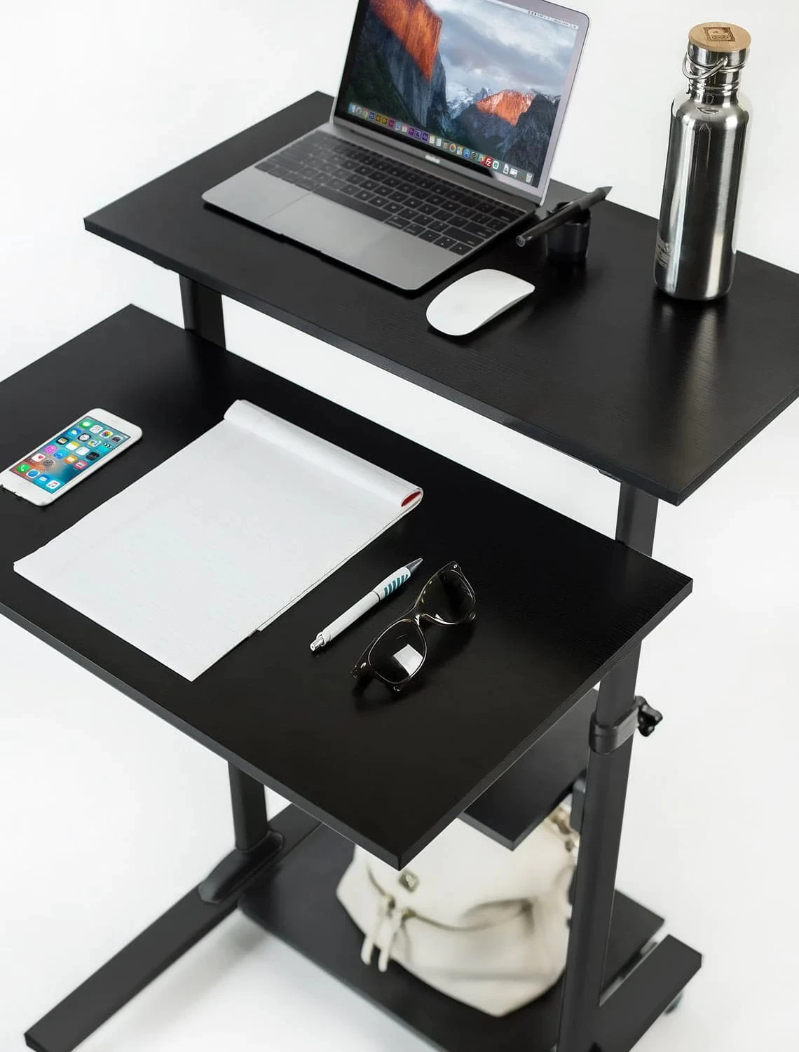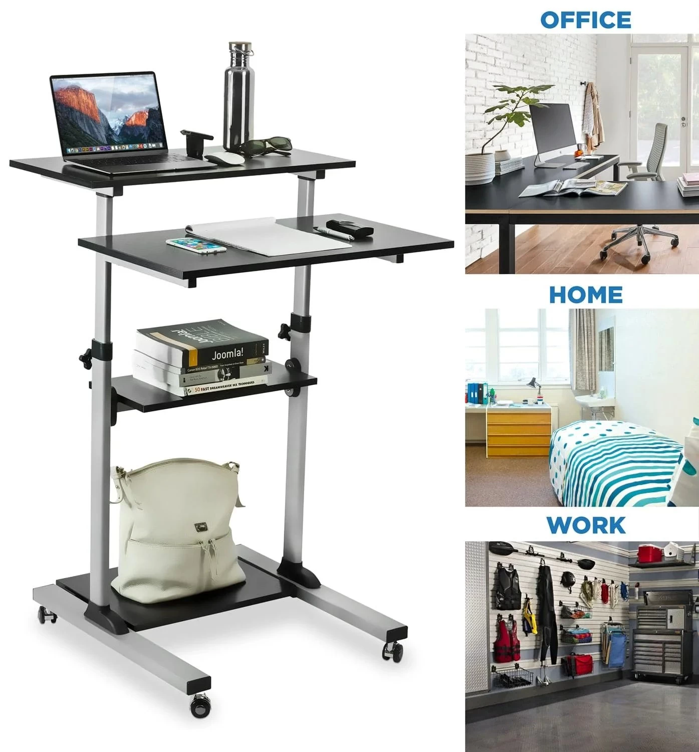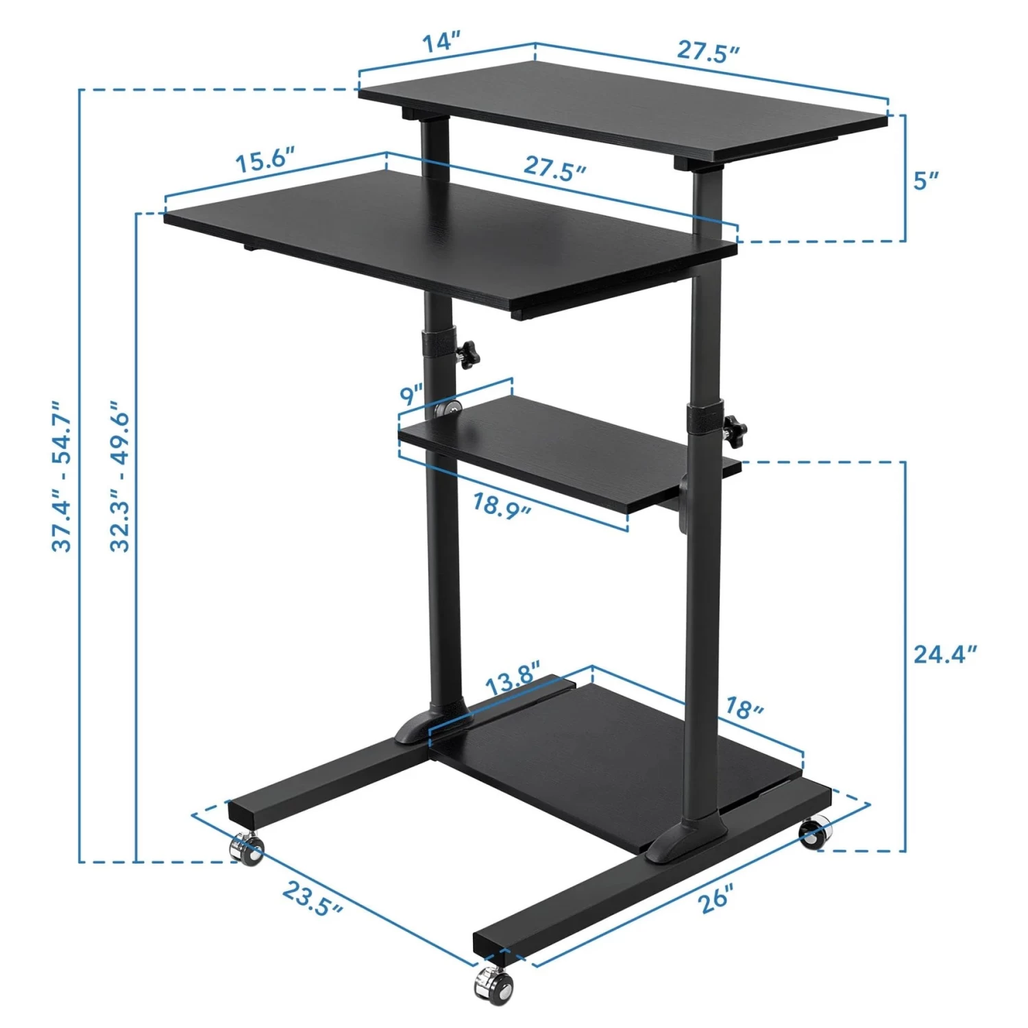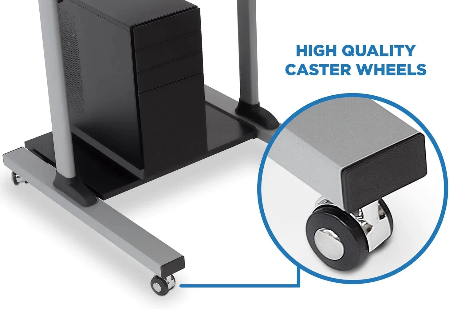 Mount-IT! MI-7940 sturdy, mobile standing desk is great for use as a mobile computer/laptop station in the office, home, hospitals, showrooms, classrooms, and more. Carefully designed platforms provide ample space for monitors, keyboards, mouse pads, PC towers and printers. Use with or without a monitor stand for an ergonomic setup. Easy-roll casters move in every direction, allowing convenient relocation from room to room. The locking casters support mobility and stability, when needed. All necessary hardware and installation instructions are provided for assembly.